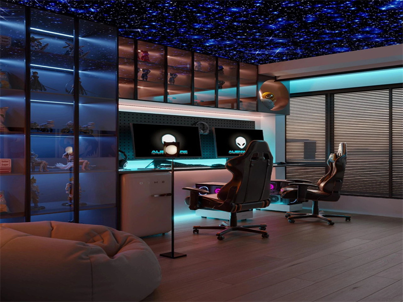 電競房選擇智能家具與不規(guī)則的幾何線條層層鋪疊,未來感的線性燈光成為空間
